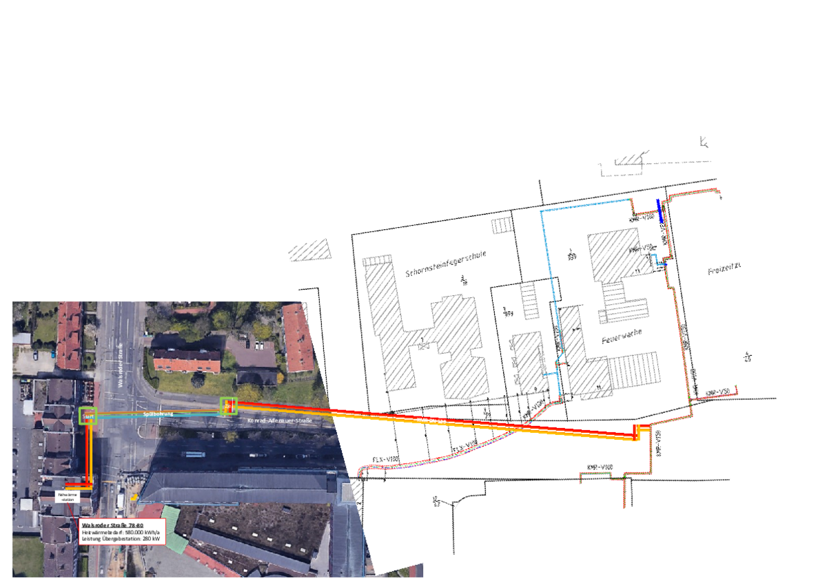 In der 36. KW (ab dem 2.9.) beginnen wir mit der Spülbohrung. In der 37. KW werden die Fernwärmeleitungen angeliefert und in die dann fertigen Bohrungen eingezogen. Diese Arbeiten werden in der 38. KW abgeschlossen sein. Im Anschluss erfolgt einerseits der Bau der Fernwärmeleitungen entlang der Konrad-Adenauer-Straße unter baubegleitender Kampfmittelüberwachung und ökologischer Baubegleitung bis zum Bestandnetz in der Nähe der Feuerwehr Langenhagen und andererseits bis in das Gebäude Walsroder Str. 78. Diese Rohrleitungs- und Tiefbauarbeiten werden sich voraussichtlich bis Februar 2025 mit anschließender Oberflächenwiederherstellung erstrecken.